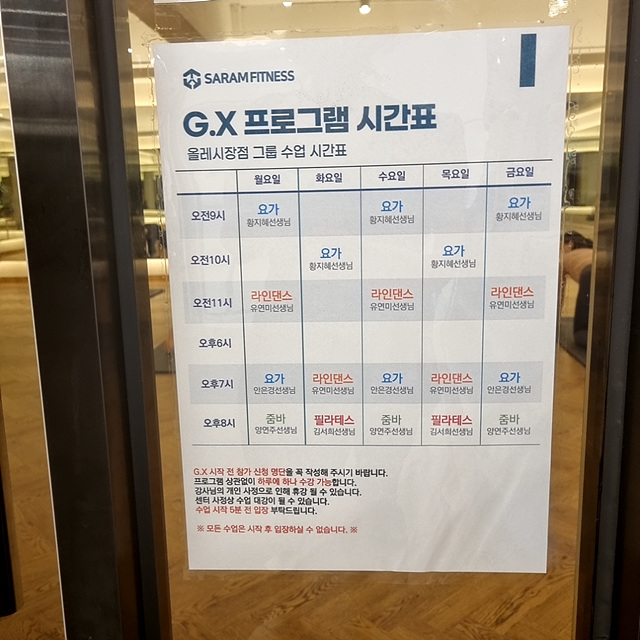 G.X 프로그램은 주중에만 운영되고 오전 9시부터 오후 8시까지 요가, 라인댄스, 필라테스, 줌바 등이 있습니다.